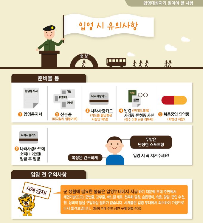 - 입영심사대 도착 시간 : 집합 시간보다 최소 10분 일찍 도착하여 여유 있게 입소하세요 .