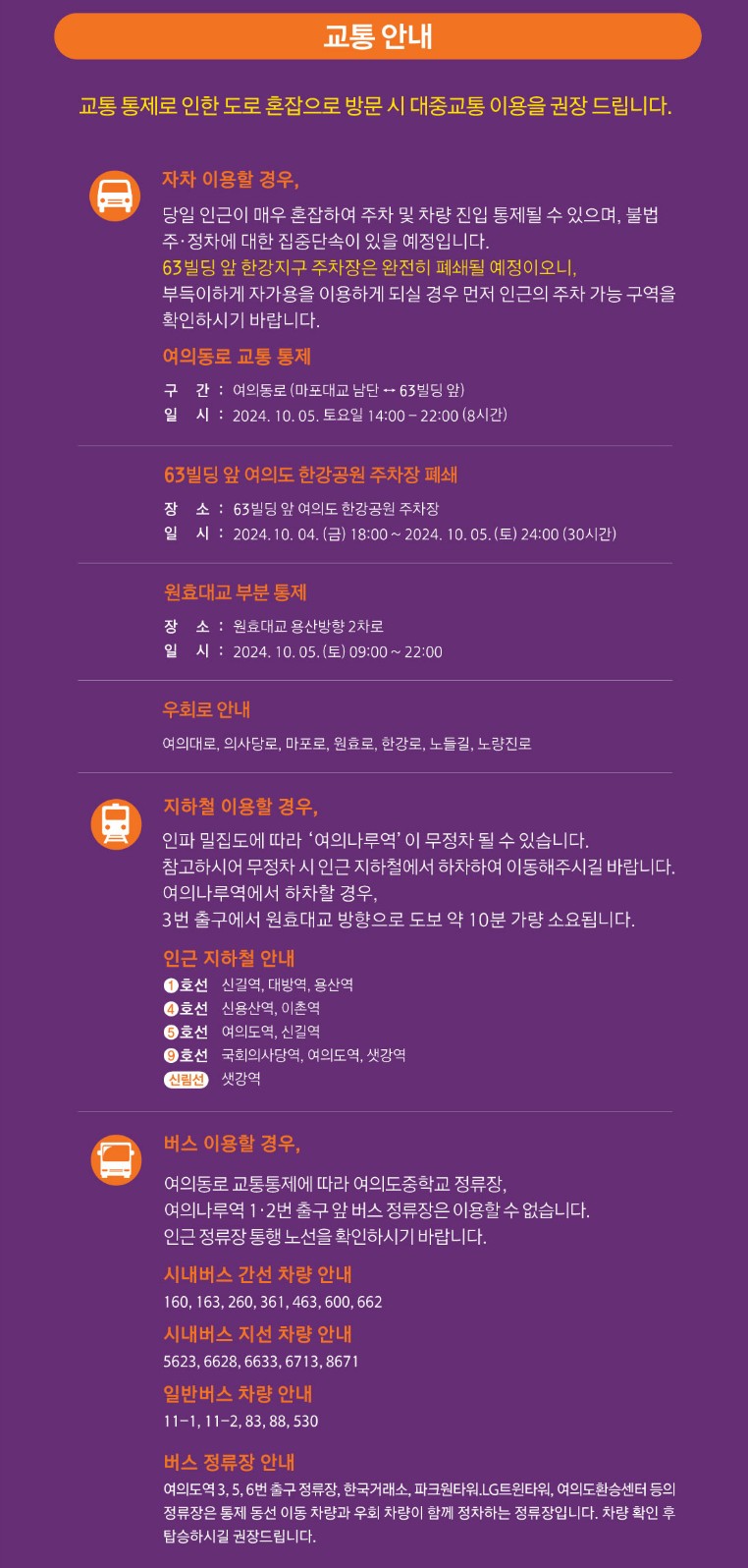 대중교통 정보및 주차 통제 구역은 다음과 같습니다.