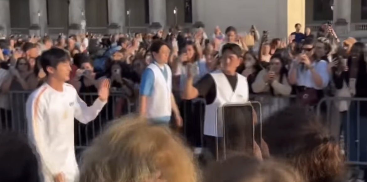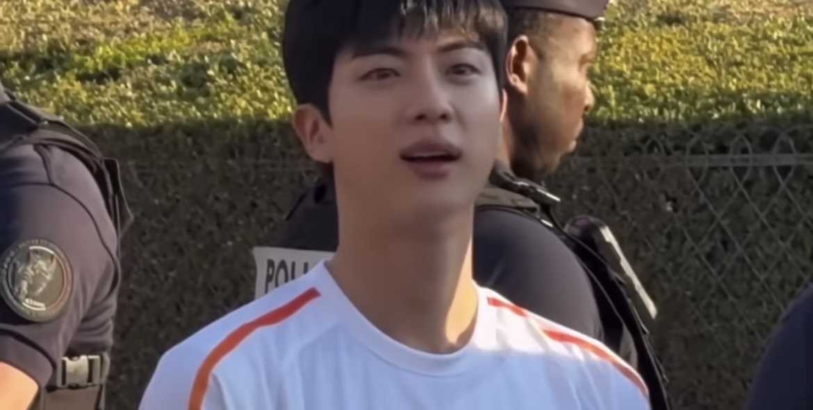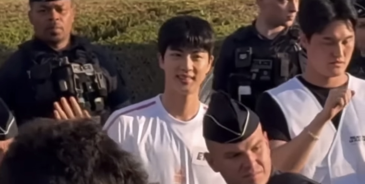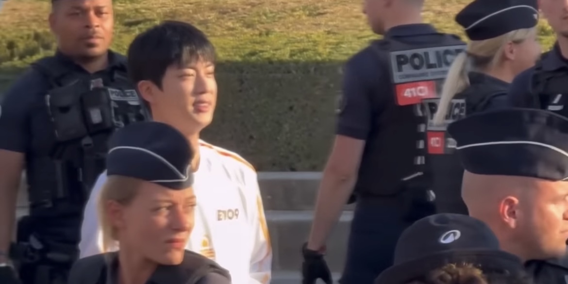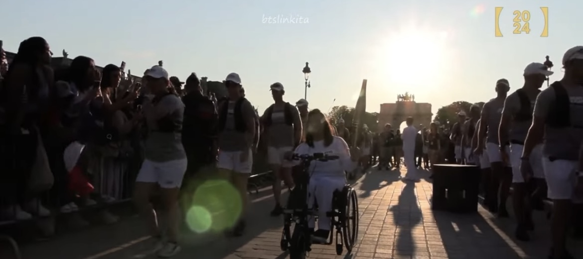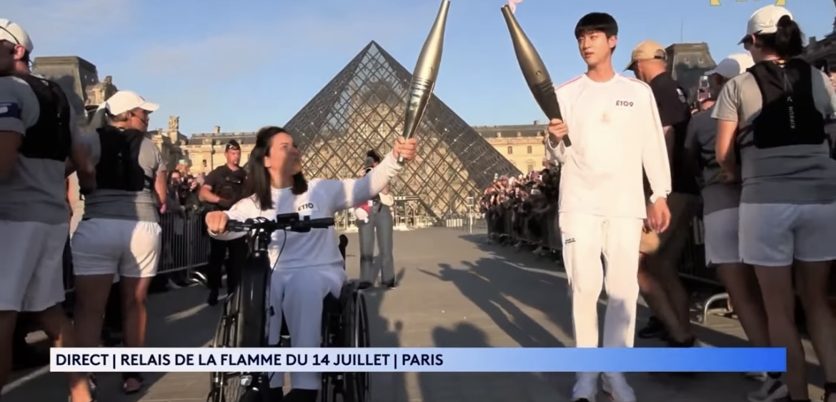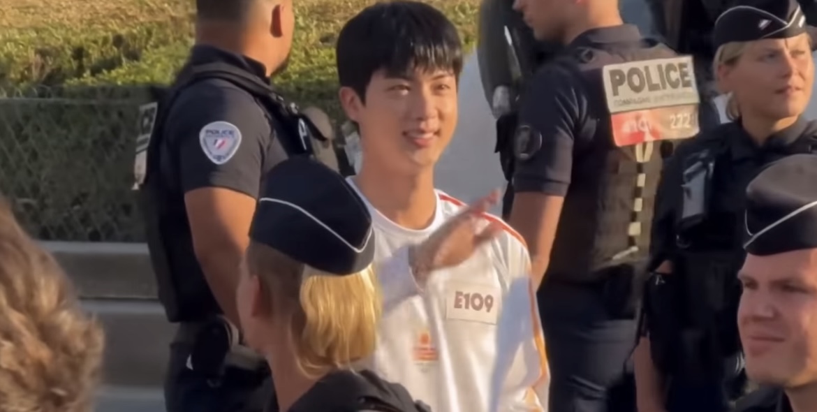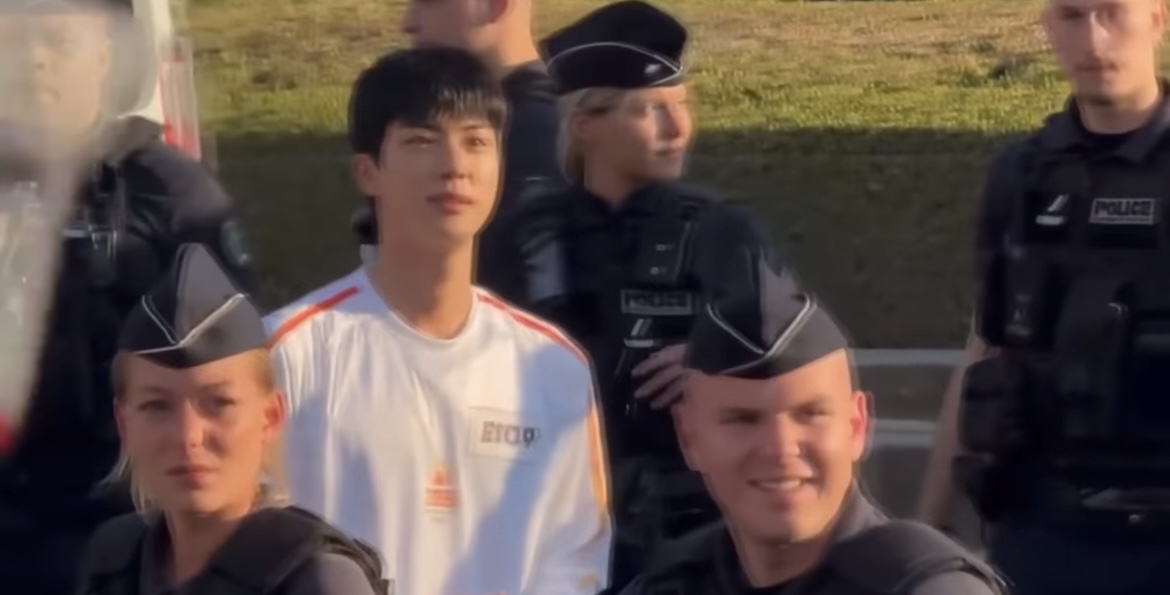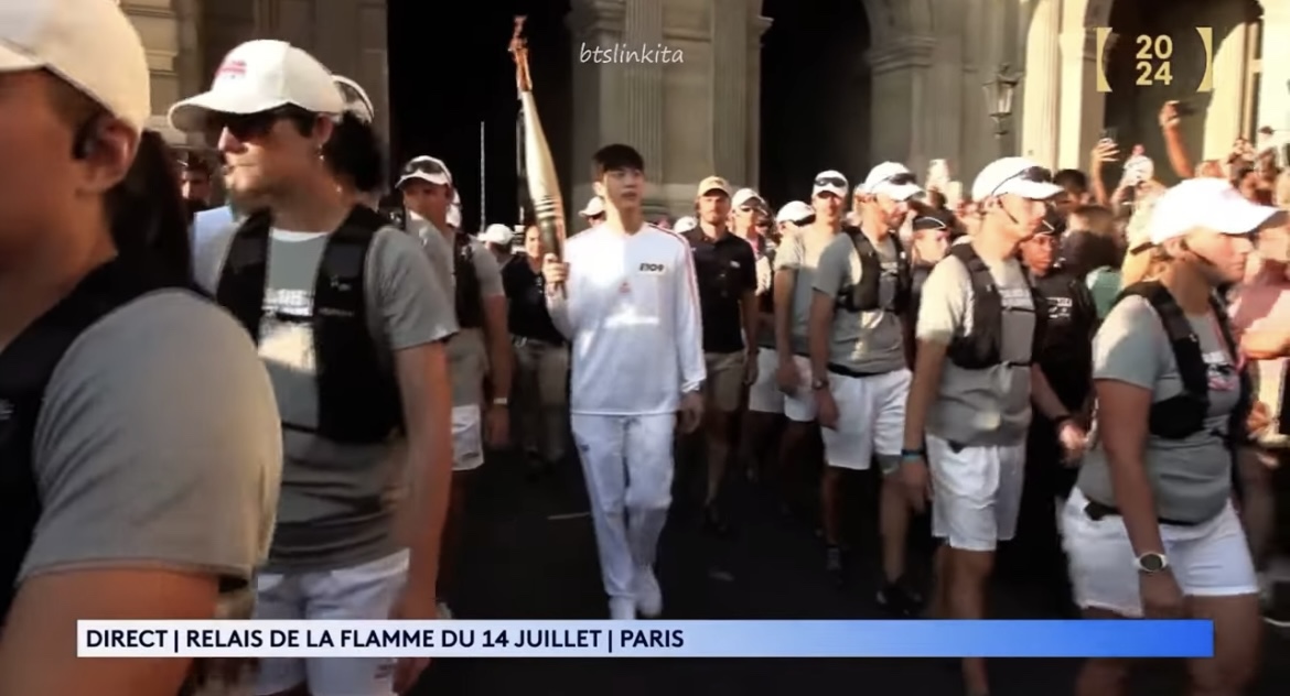 이날 행사는 파리의 아름다운 배경과 함께 진행되었으며, 진은 올림픽 성화를 들고 당당하게 행진했습니다.